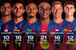 体育资讯03月23日讯 世体统计了巴萨球员本赛季的进球贡献数据,亚马尔以21球15助排在第一位,费尔明12球16助第二,拉菲尼亚19球7助第三。